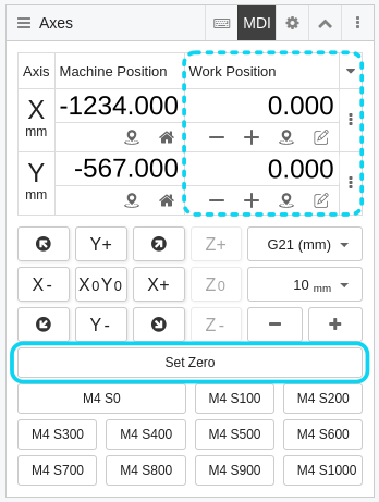 - Using the jog controls, move the toolhead to where you would like to put the origin of your drawing. You can change the jog step size using the +/- buttons or the drop down menu. If you are using the whole area of the machine for your drawing, leave the toolhead in the home position.