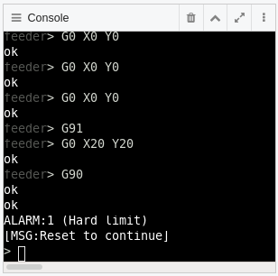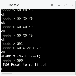 If the toolhead tries to move outside of the limits of the drawing area, the machine will enter an alarm state. This can be detected via the coordinate position (soft limits), or one of the limit switches (hard limits).