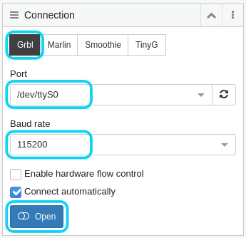 Reset. You should seeGrbl 1.1f ['$' for help]appear in the console widget.