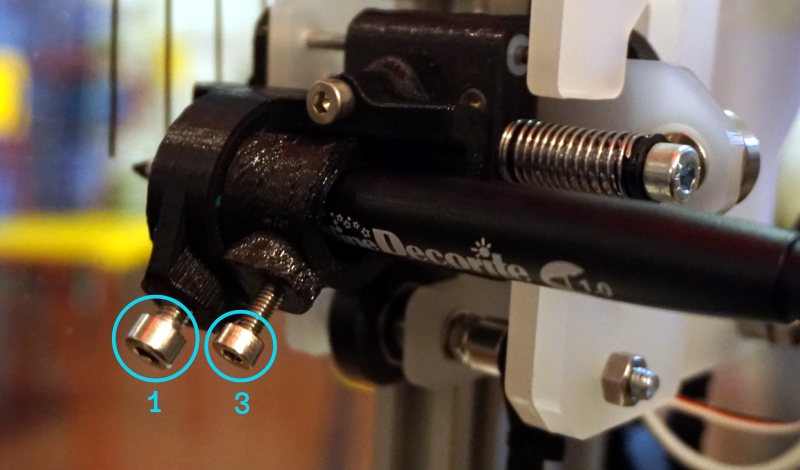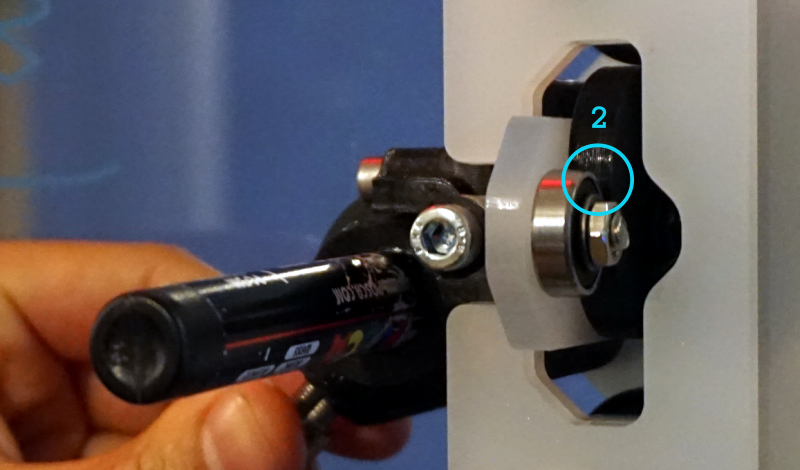 - While holding the pen so that it is touching the drawing surface, and pull back the toolhead so that there is a small gap (3-4mm) between the bearing and the cam (2). Then tighten the small screw (3).