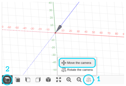 Make sure the mouse control is set to Move the Camera in order to pan the view (1). You can return to a 2D view by selecting the top view shortcut (2) (you may need to select another view first).