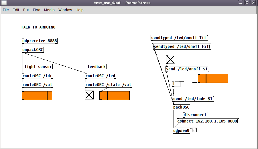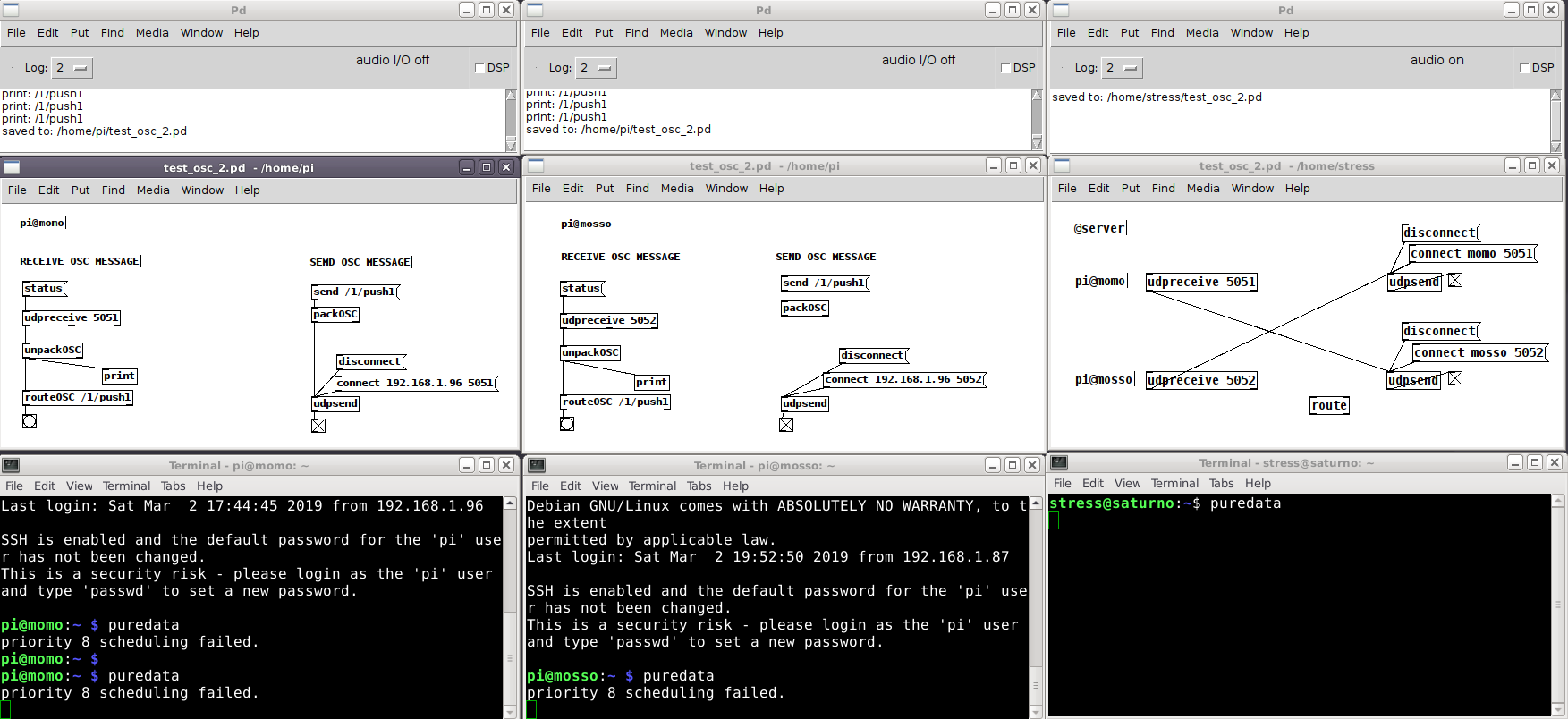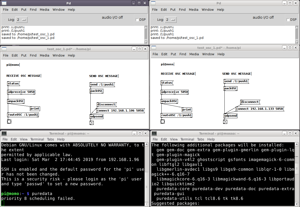 Cada uma das máquinas envia e recebe mensagens de osc através de udpsend e udpreceive, criadas pelos objetos osc da biblioteca pd-osc.